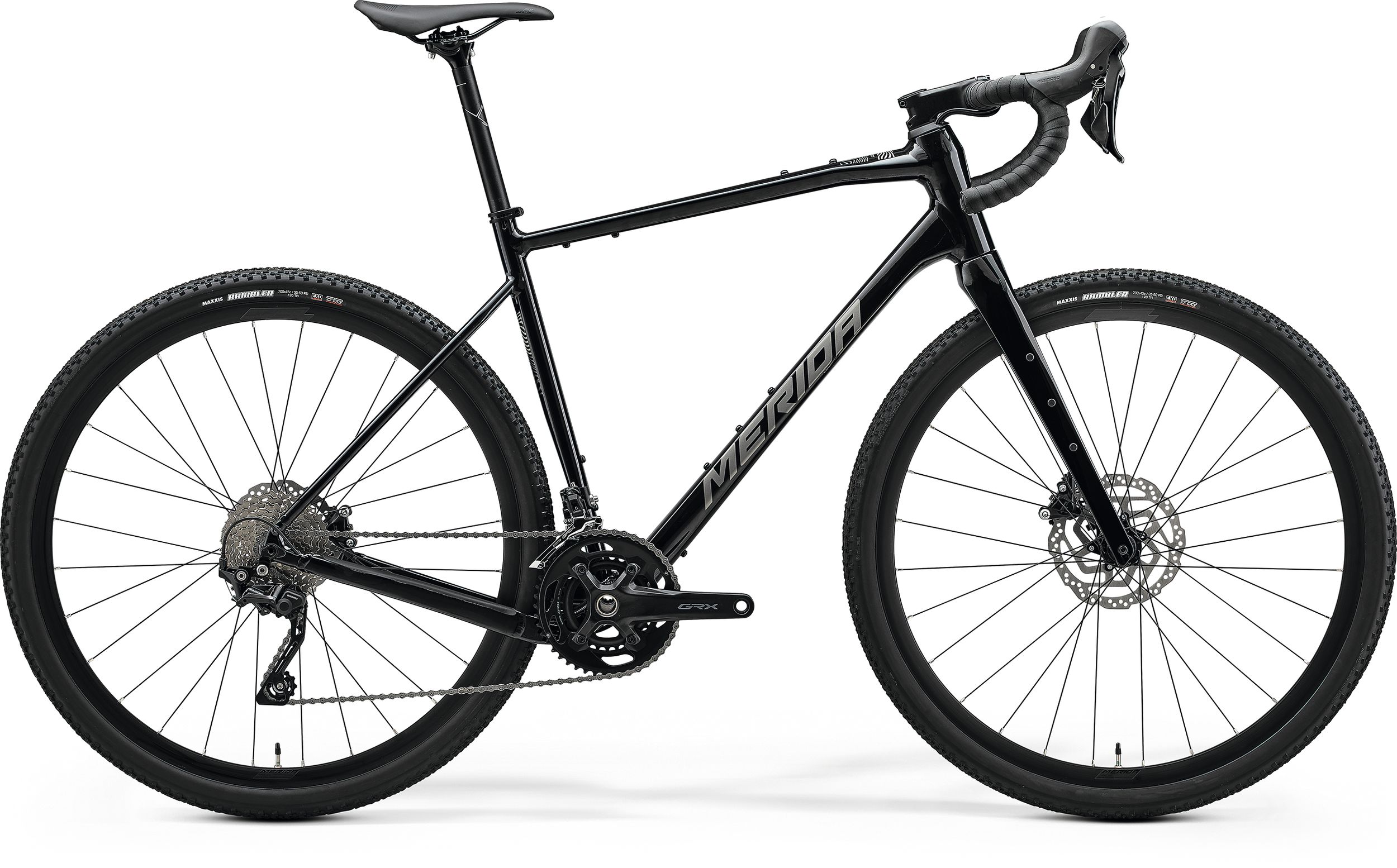 Ważnym elementem Meridy Silex 400 jest solidny napęd Shimano GRX z przerzutkami GRX400 i korbą GRX600 46-30, rower ma 10-rzędową kasetę 11-36. Precyzyjne prowadzenie zapewni Ci stożkowa główka ramy. Świetną kontrolę nawet nad obładowanym rowerem dadzą hydrauliczne hamulce tarczowe Shimano GRX400 wyposażone w 180-mm tarcze hamulcowe z przodu i 160-mm z tyłu. Z przodu w okolicach zacisku hamulca znajduje się Disc Cooler, system chłodzenia, który zapobiega przegrzewaniu się hamulca. Silex 400 toczy się na solidnych kołach Merida Expert SL II (tubeless ready) i jest wyposażony w 12-mm sztywne osie, które zwiększają sztywność boczną i wzmacniają koło. Odpowiedni komfort jazdy zapewniają 45-mm opony Maxxis Rambler. Rama i widelec mają wiele punktów mocowania, które mogą się przydać na wyprawie i nie tylko.